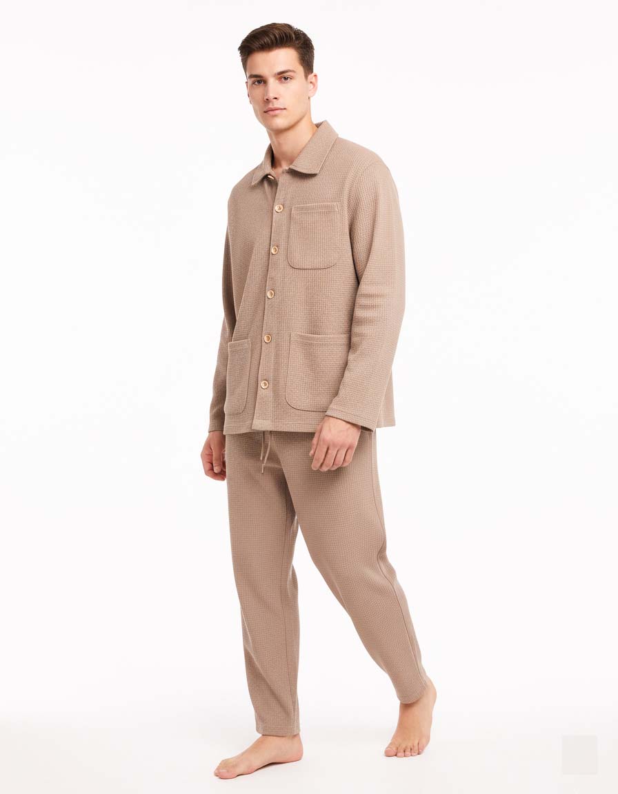The beige tone offers a warm, versatile base that pairs seamlessly with tees, trousers, denims, and winter knits. Finished with precise stitching, a structured collar, and minimal detailing, this jacquard shacket delivers understated refinement while ensuring durability and comfort for effortless daily wear.