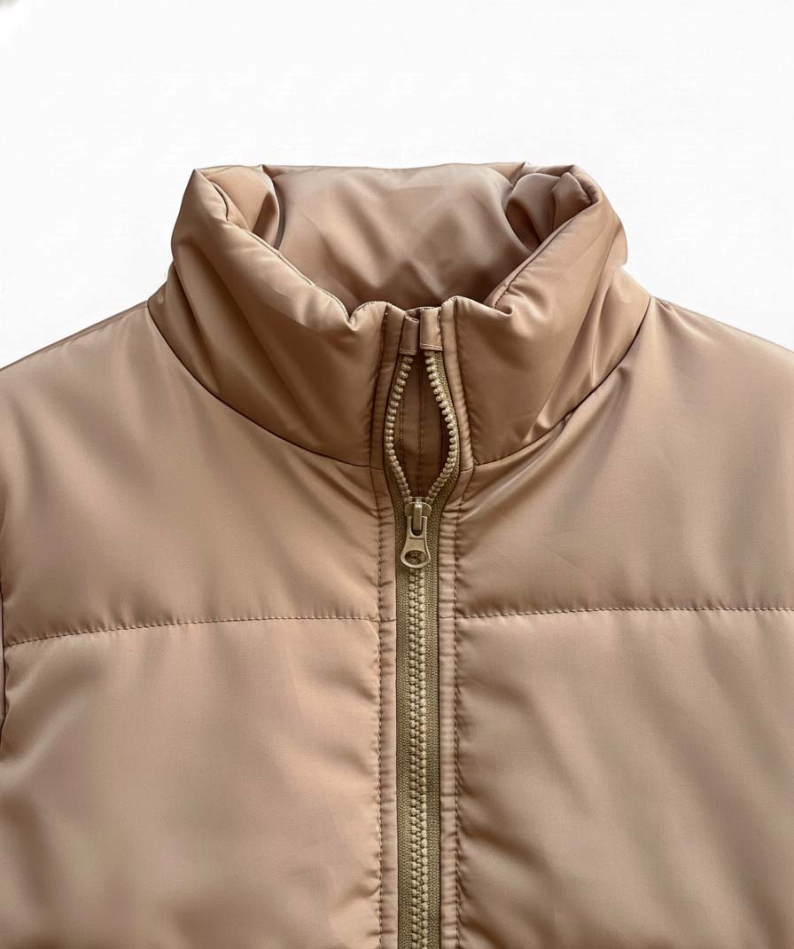 The soft beige tone brings a refined, contemporary aesthetic, offering a clean and elevated look that pairs effortlessly with neutrals, denims, and winter layers. With its structured silhouette, padded warmth, and polished minimal details, this puffer jacket adds a sophisticated edge to your cold-weather outfits.