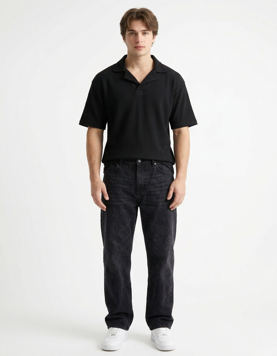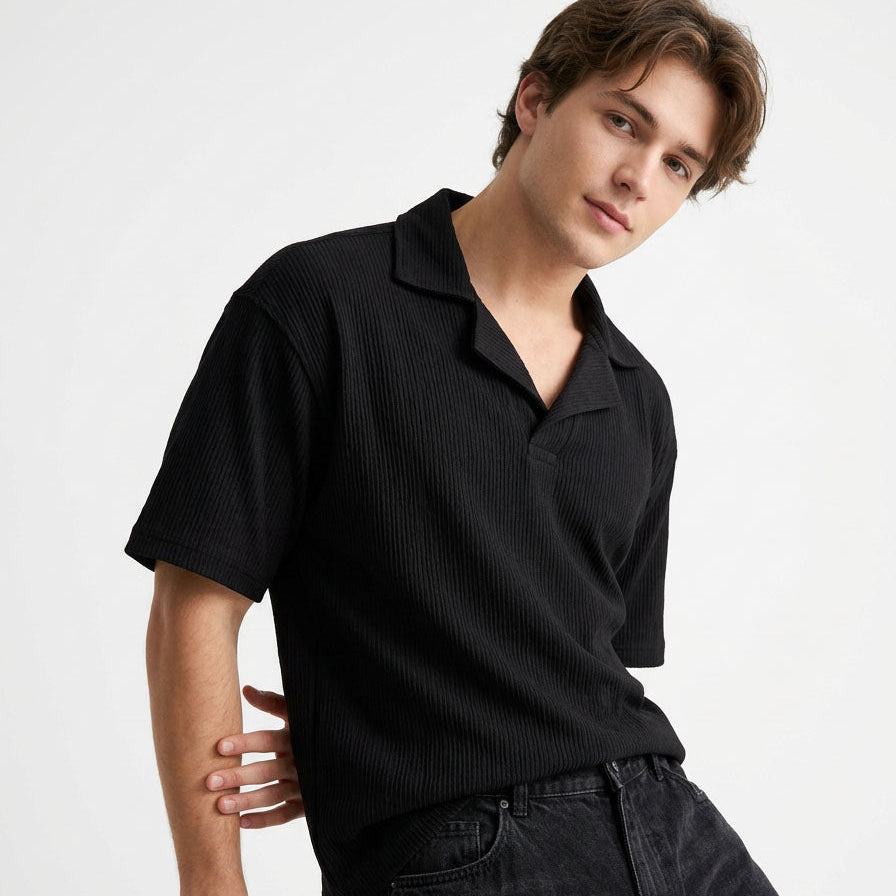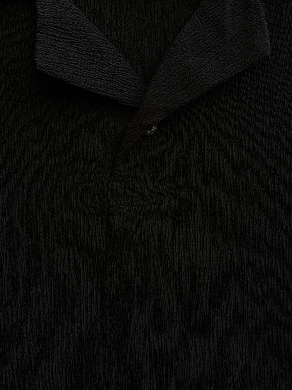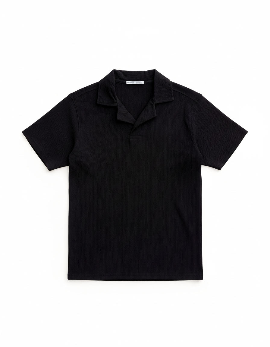 The textured knit surface paired with a distinctive coat-style collar adds a refined character that sets it apart from traditional polos. The deep black tone enhances its sleek and versatile appeal, making it perfect for smart-casual occasions, evening outings, or elevated everyday styling.