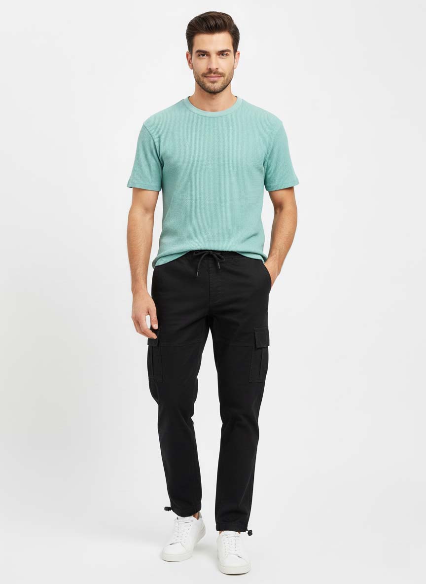 Caparison's Black Cotton Cargo Trouser brings everyday utility into your modern wardrobe. Tailored from 100% breathable cotton with a straight-leg fit, this trouser features spacious side cargo pockets and a clean black color that pairs effortlessly with tees, polos, or hoodies. Built for comfort and function — whether you’re on the go or off duty.