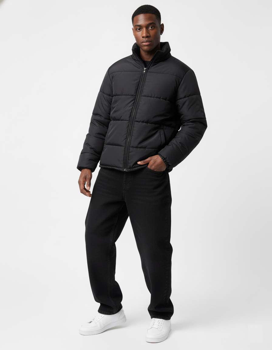 Pair the Black Puffer Jacket with black denims, a mock-neck sweater, or winter chinos for a sharp cold-weather look. Add sneakers or boots for a balanced outfit perfect for travel, everyday wear, and evening outings.