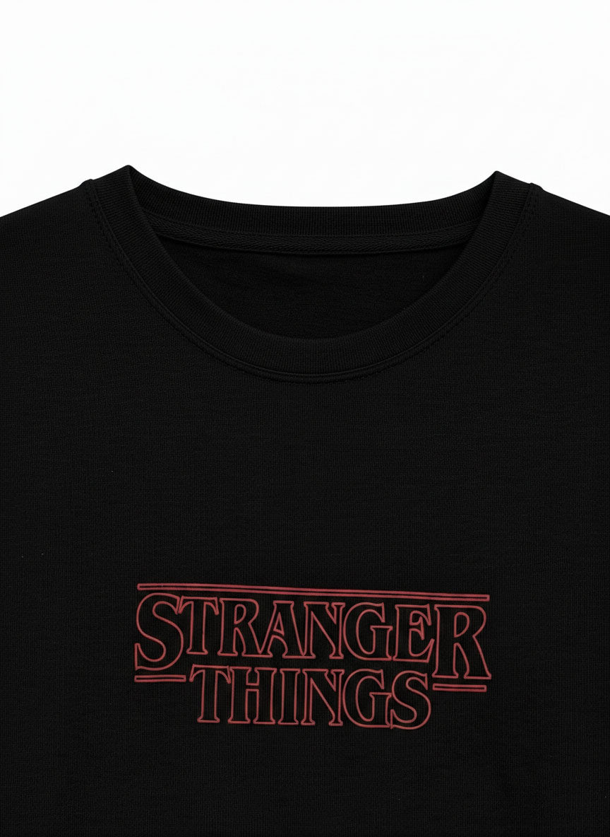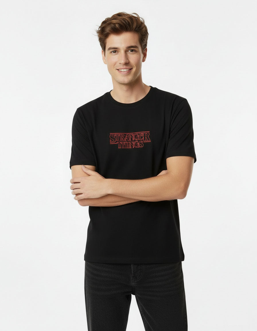 Step up your casual wardrobe with Caparison’s Stranger Things Graphic T-Shirt in Black, featuring the bold and iconic Stranger Things logo. Crafted from soft, breathable cotton, this tee provides lightweight comfort and all-day wearability while making a statement for fans and streetwear enthusiasts alike.