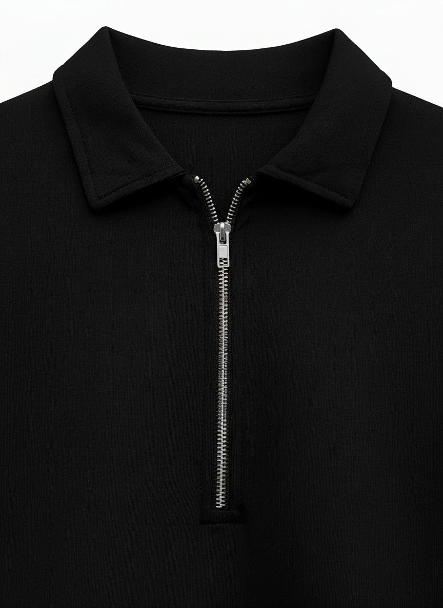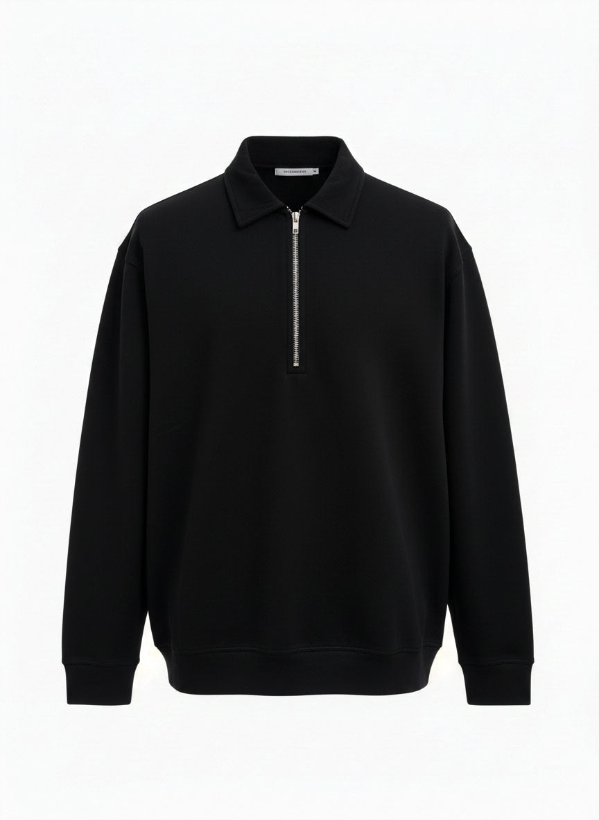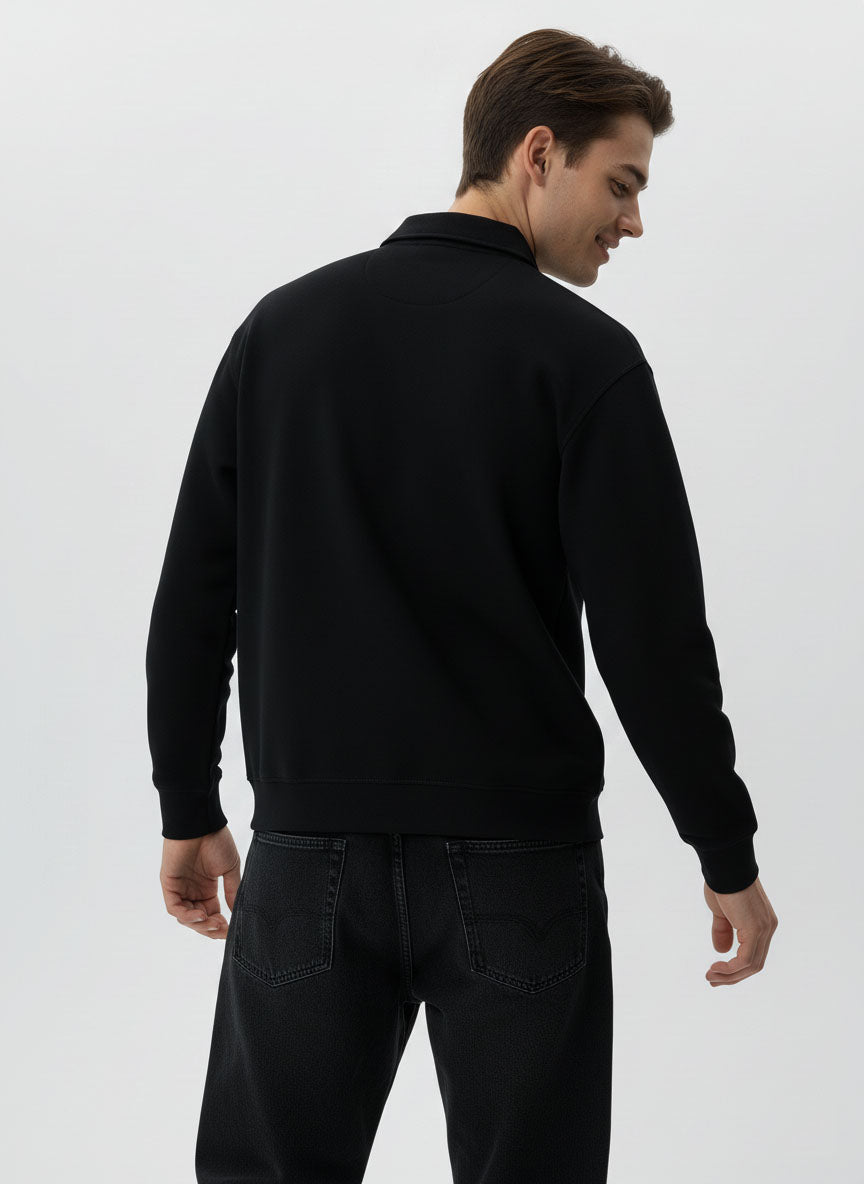 Pair the Black Zip Collar Sweatshirt with grey, navy, or black denim for a sleek winter look. Layer under jackets or coats for added warmth, and complete your outfit with sneakers or boots for a modern, urban aesthetic.