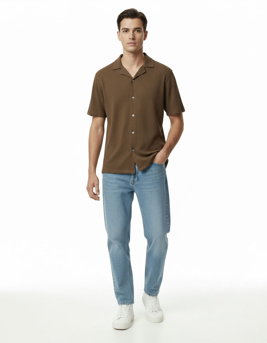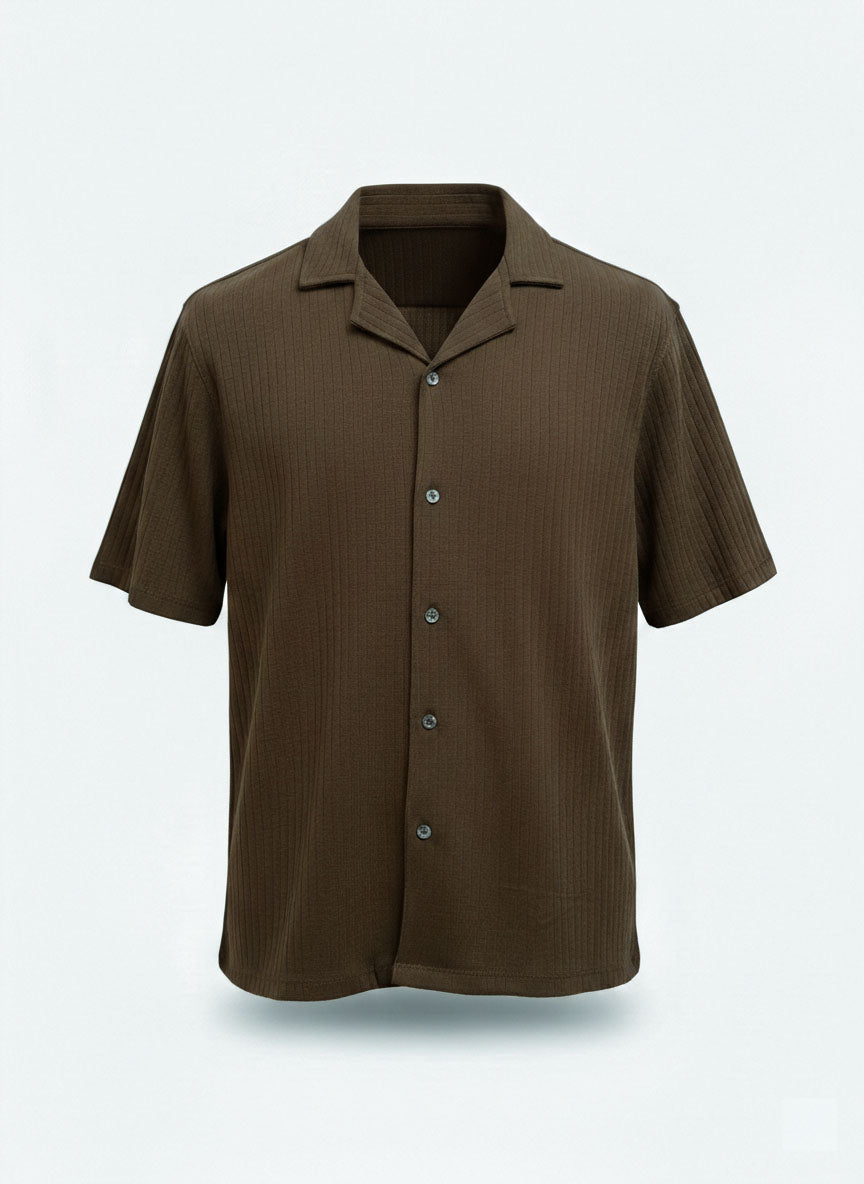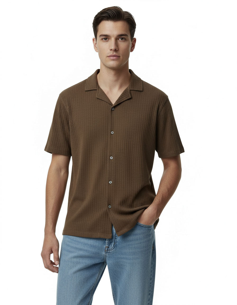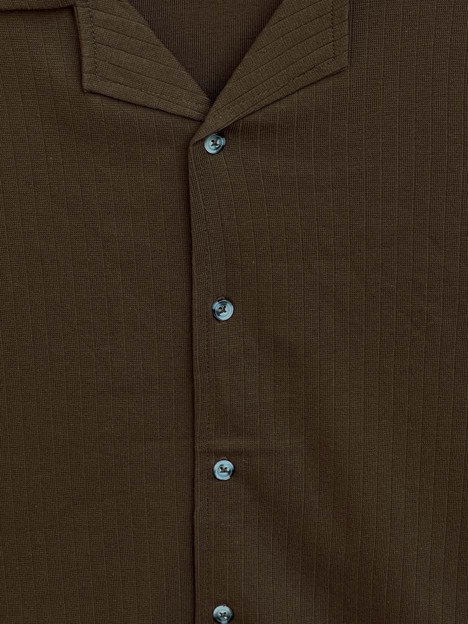 The rich brown tone adds warmth and depth, offering a refined alternative to basic tees. Whether paired with denim for a clean casual outfit or styled with tailored trousers for a semi-formal setting, this knit T-shirt delivers effortless versatility. The structured silhouette enhances your overall look while maintaining all-day comfort.