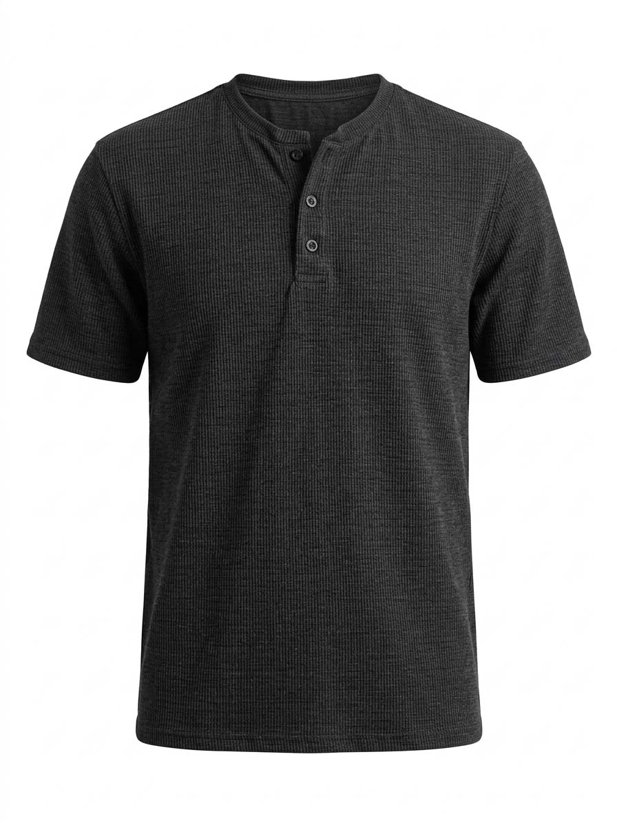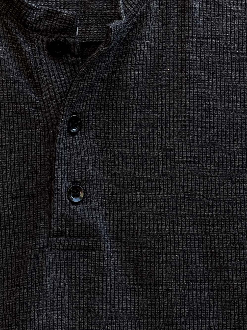 The jacquard textured surface adds depth and a subtle pattern, elevating this everyday essential with a premium touch. The charcoal tone brings a sleek and versatile look, perfect for effortless styling across casual and smart-casual outfits. Finished with a classic Henley neckline and button placket, this piece blends relaxed comfort with contemporary detailing.