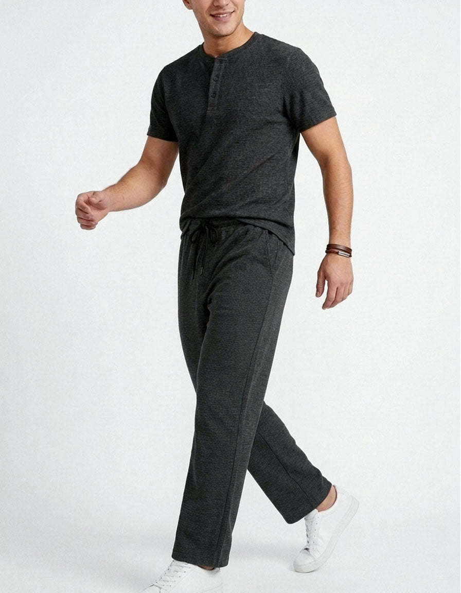 Pair this Charcoal Jacquard Henley T-Shirt with denim or chinos for a clean casual look, or layer it under a jacket for a more elevated outfit. Complete the look with sneakers or loafers for a modern everyday style.