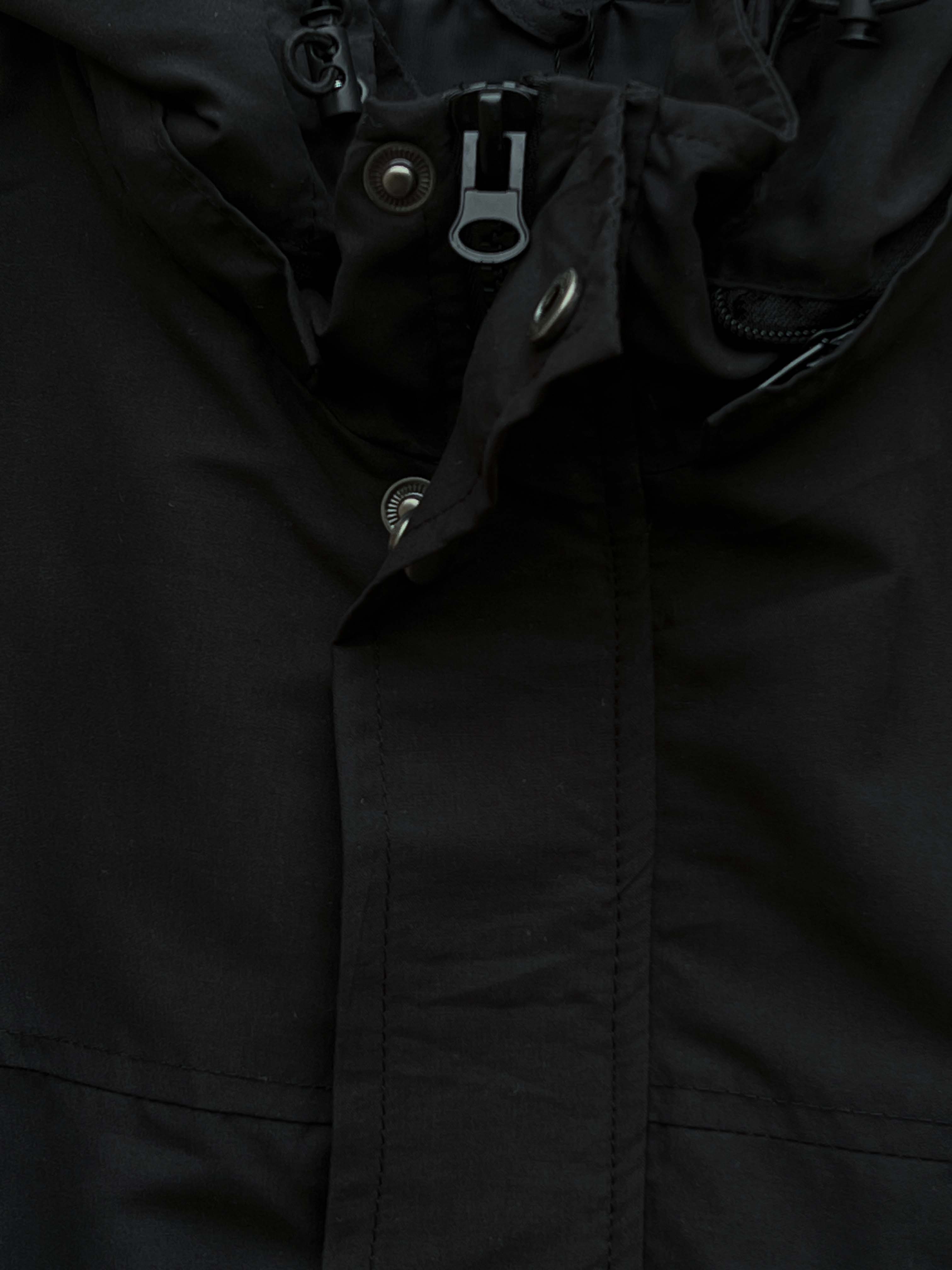 Details: Full front zipper closure, functional side pockets, hooded design, minimal branding