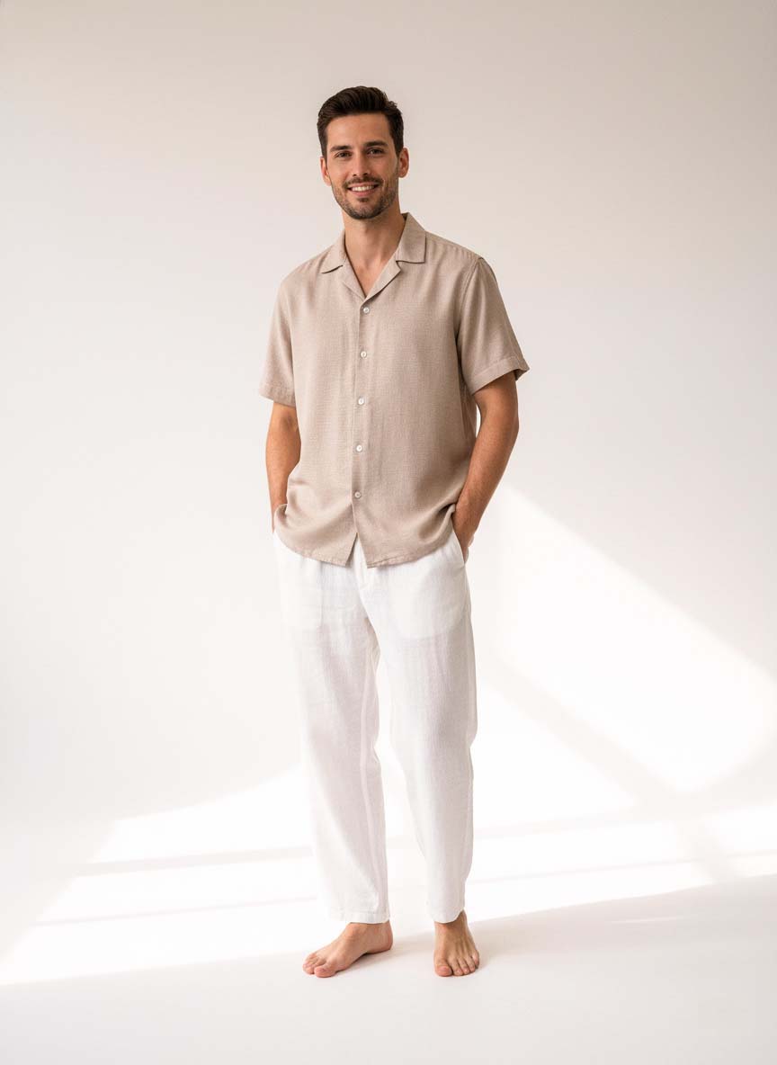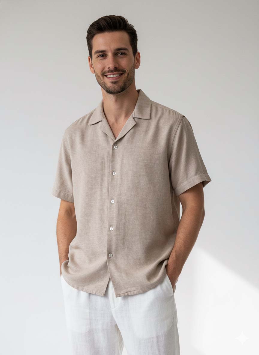 With its soft structure and elegant neutral hue, this shirt is a versatile wardrobe staple — designed for men who appreciate understated luxury.
