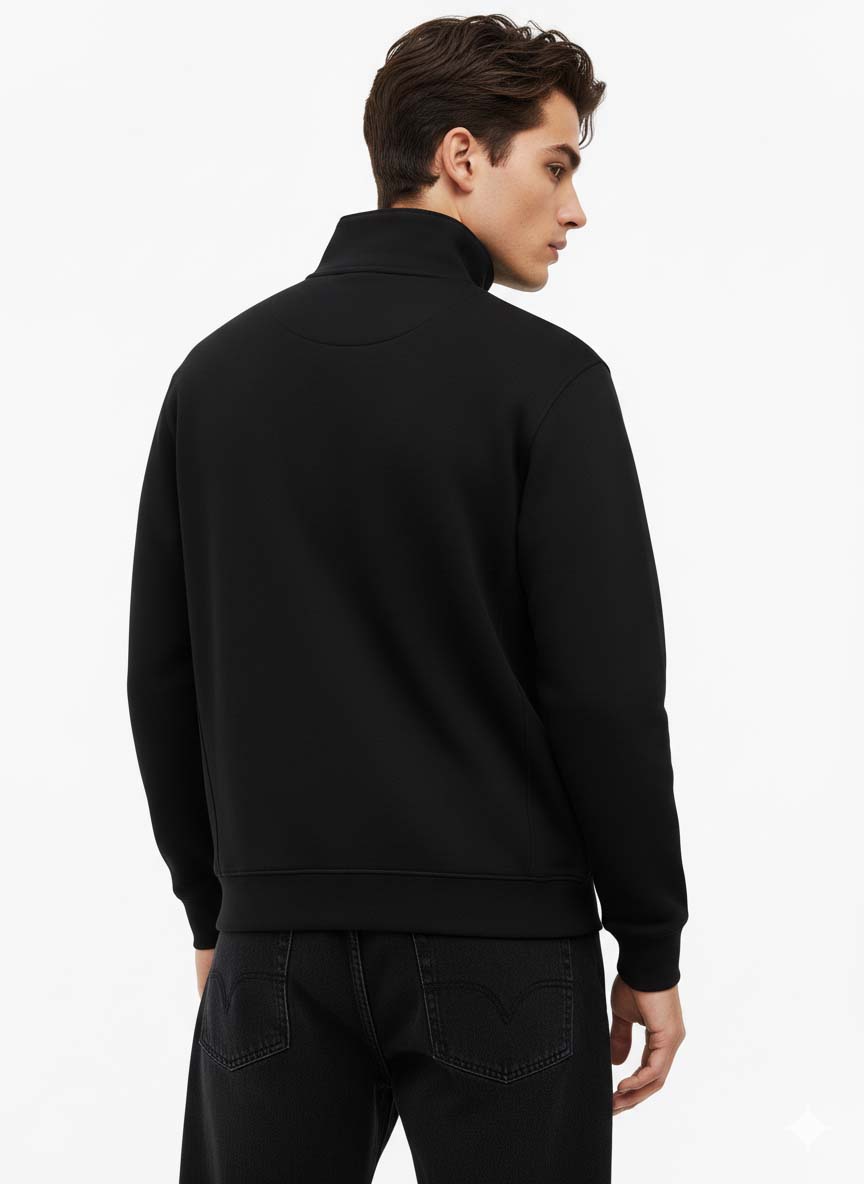 Pair the Black Mock Neck Sweatshirt with dark denim, tailored trousers, or neutral chinos for a sharp winter look. Complete the outfit with sneakers or boots and layer with a jacket for added warmth and structure.