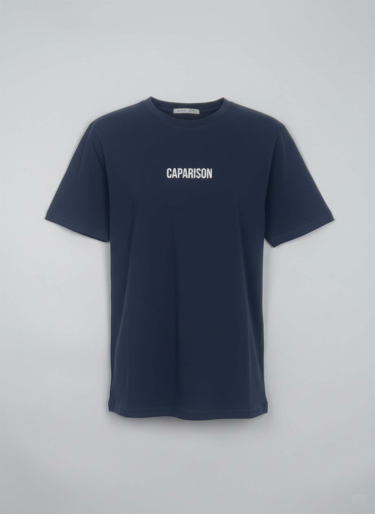 Show your style loyalty with Caparison's Navy Graphic Tee featuring the bold "Caparison" text across the chest. This everyday essential is crafted from 100% cotton for breathable comfort and finished with a clean silhouette and ribbed neckline. Whether worn solo or layered, it offers a modern, street-ready look that speaks for itself.