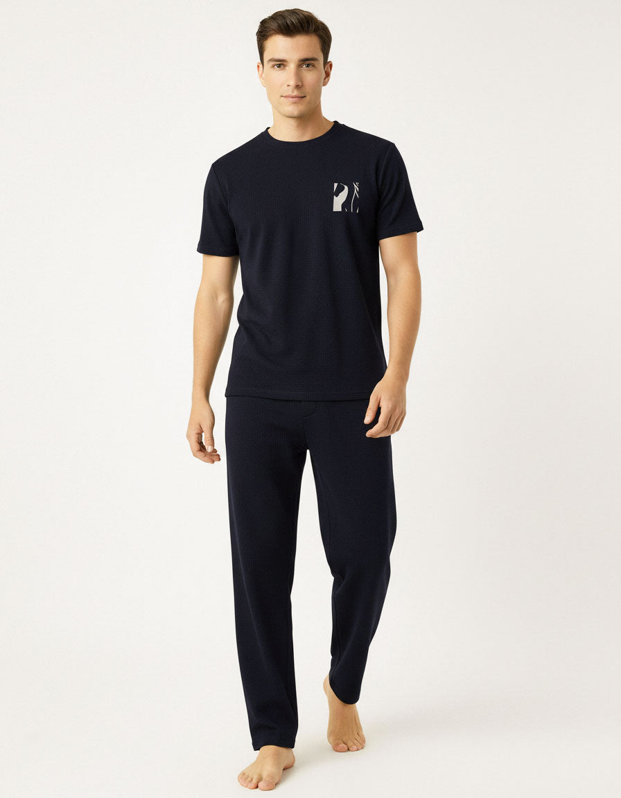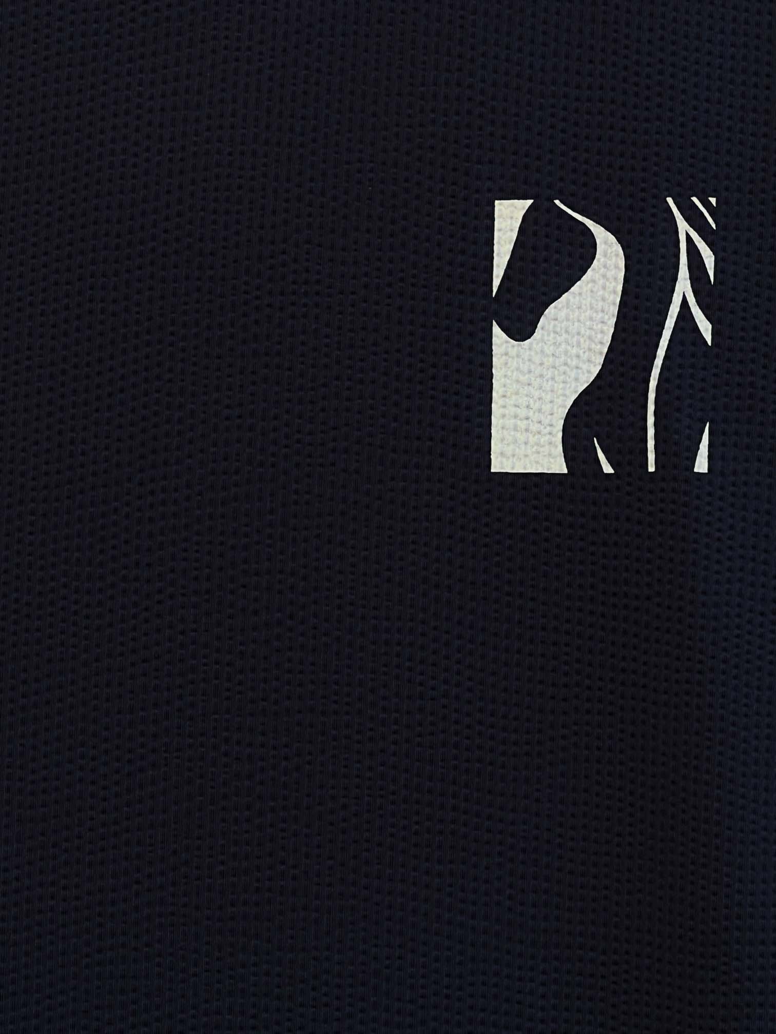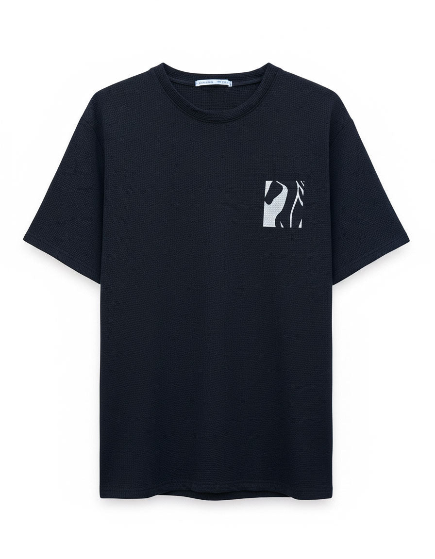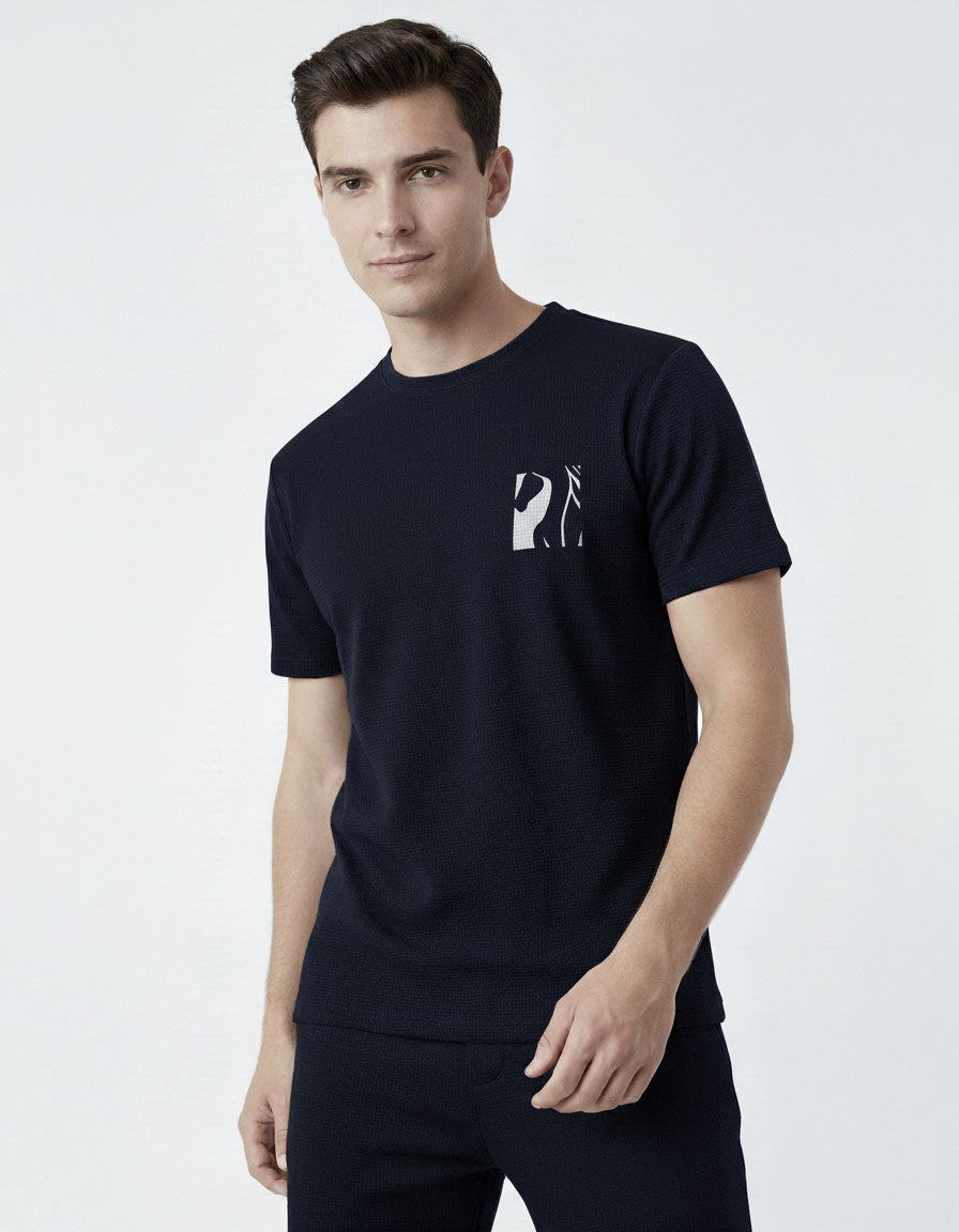 Featuring a modern graphic detail on a rich navy base, this tee delivers a clean yet stylish look that pairs perfectly with jeans, joggers, or knit trousers. Its soft texture and flexible fit provide all-day comfort while maintaining a sharp, contemporary appearance.