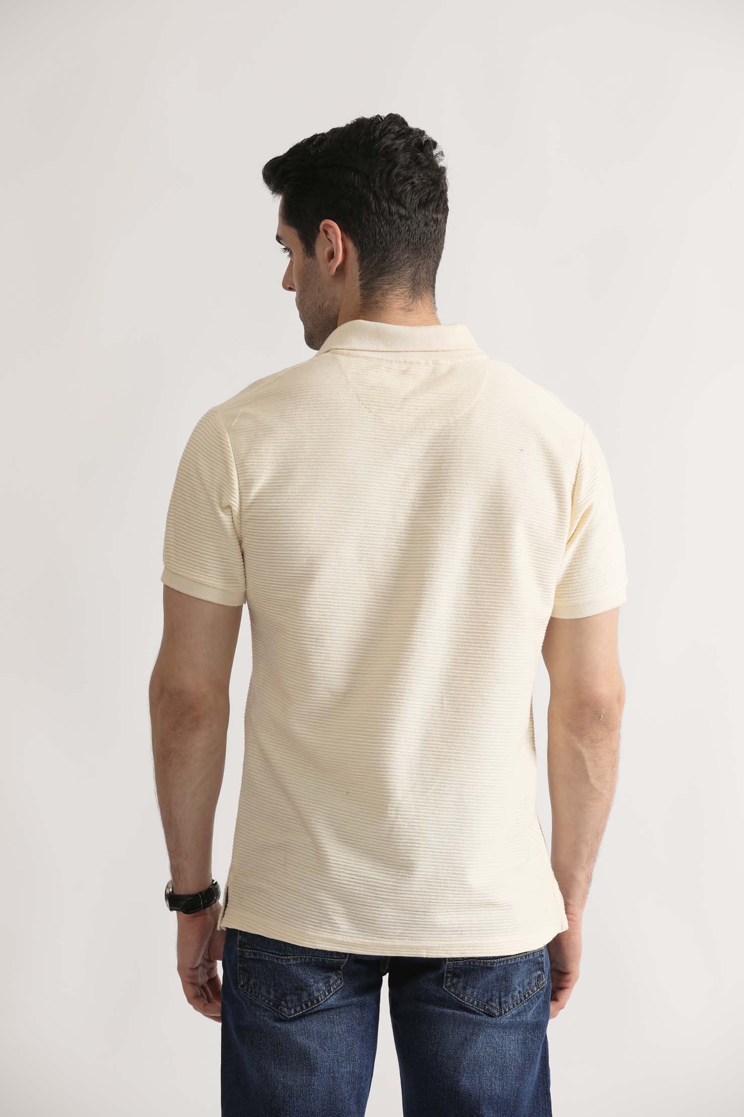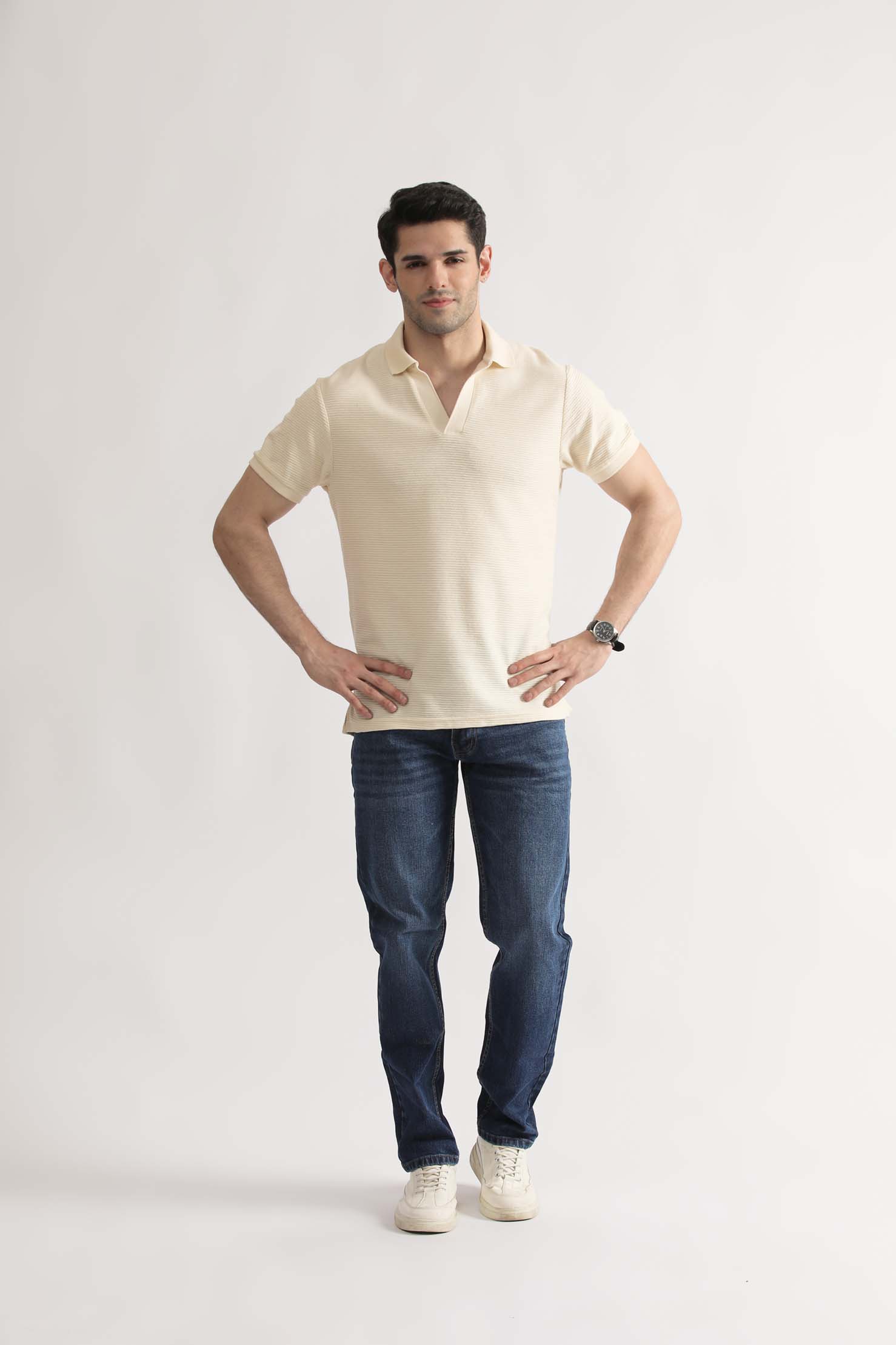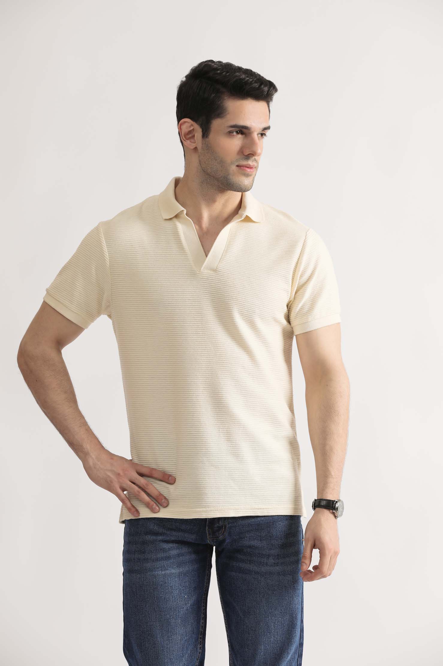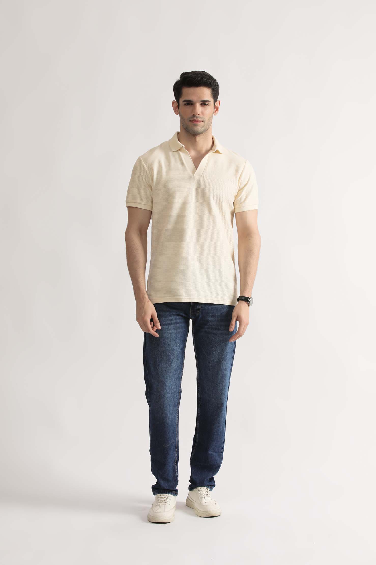Pair it with slim-fit trousers or relaxed denim for a balanced, contemporary look. The Jacquard V-Neck Polo is where comfort meets sophistication  a must-have for the modern wardrobe.