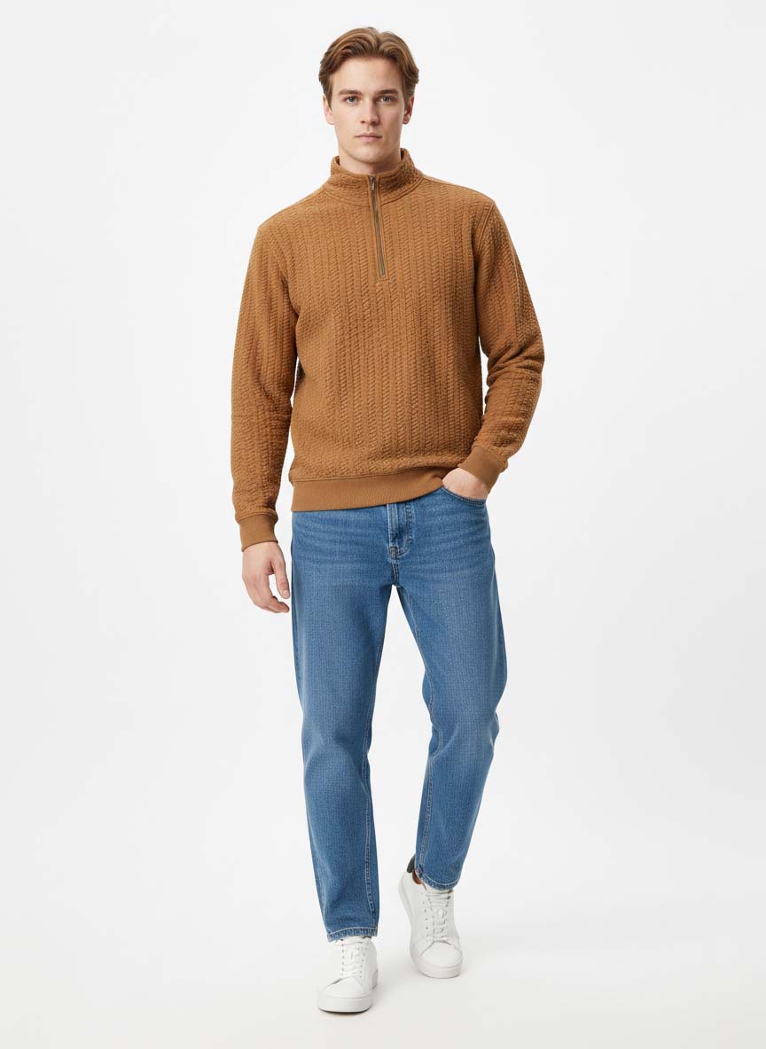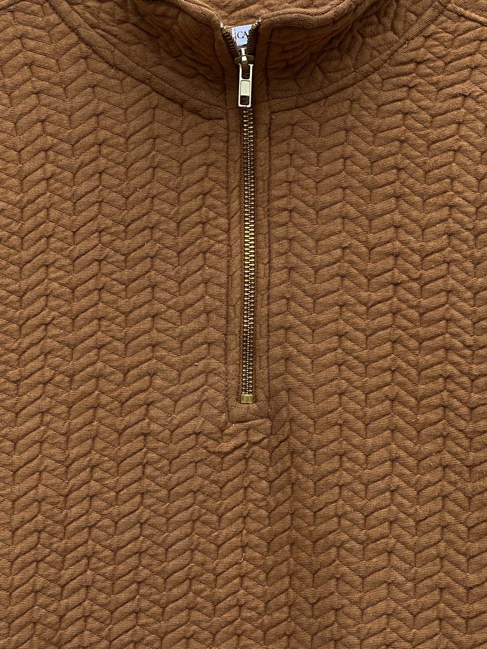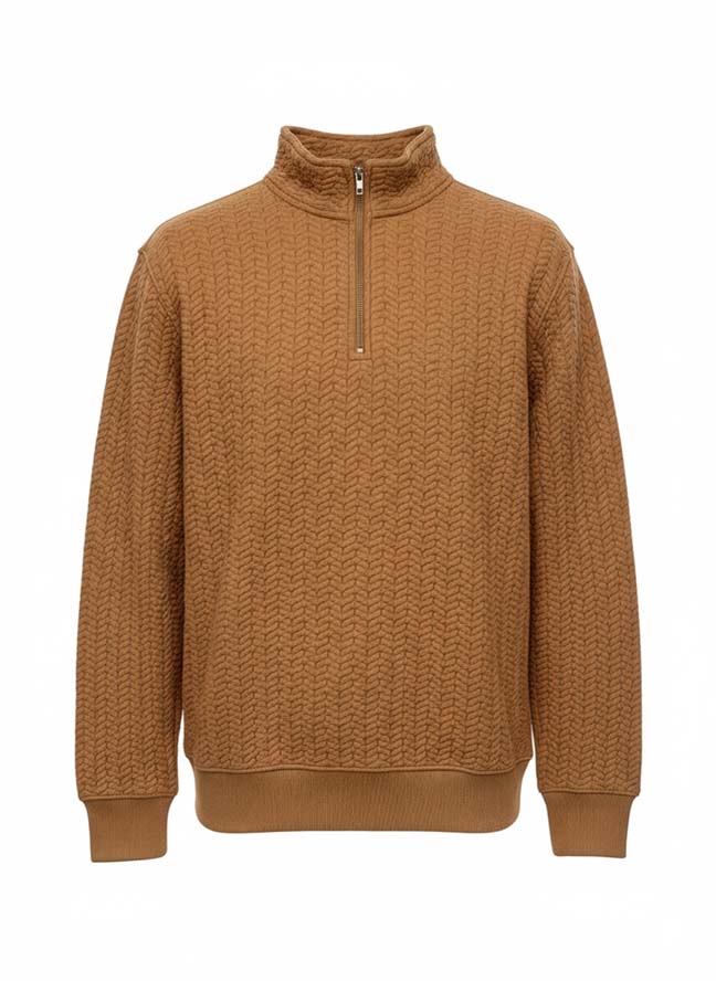 Style the Rust Quilted Mock Neck Sweatshirt with beige, black, or dark blue denim for a balanced winter outfit. Complete the look with neutral sneakers or boots for a refined casual finish.