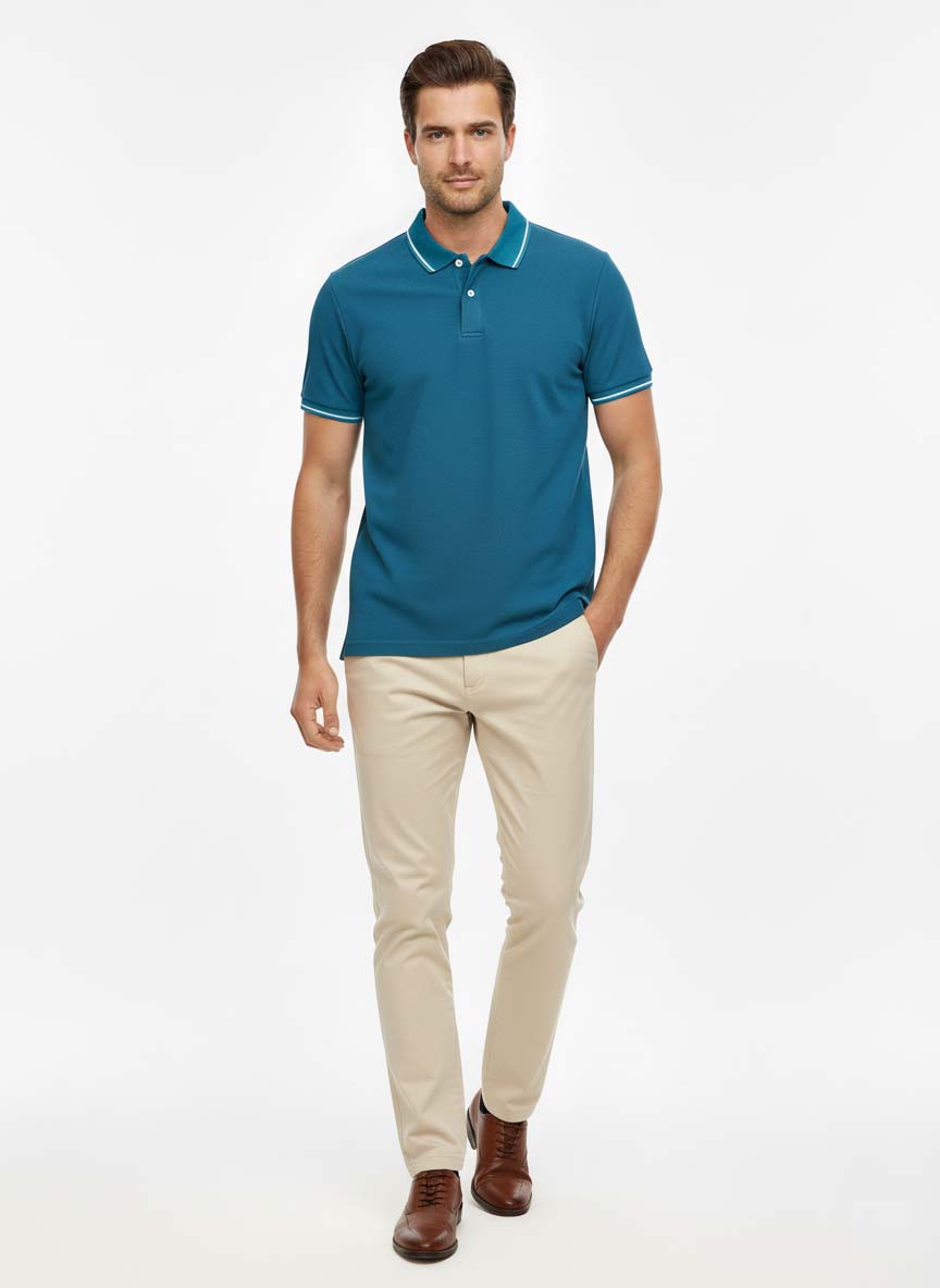 Caparison's Teal Blue Tipping Collar Polo Shirt combines timeless structure with modern contrast detail. Crafted from 100% breathable cotton, this shirt features clean tipping on the collar and a flattering regular fit. The teal blue shade adds fresh energy to your wardrobe - ideal for day-to-night styling.