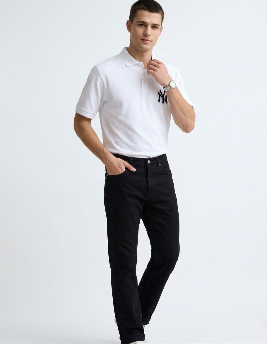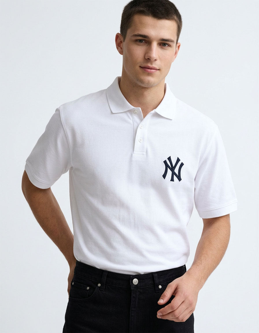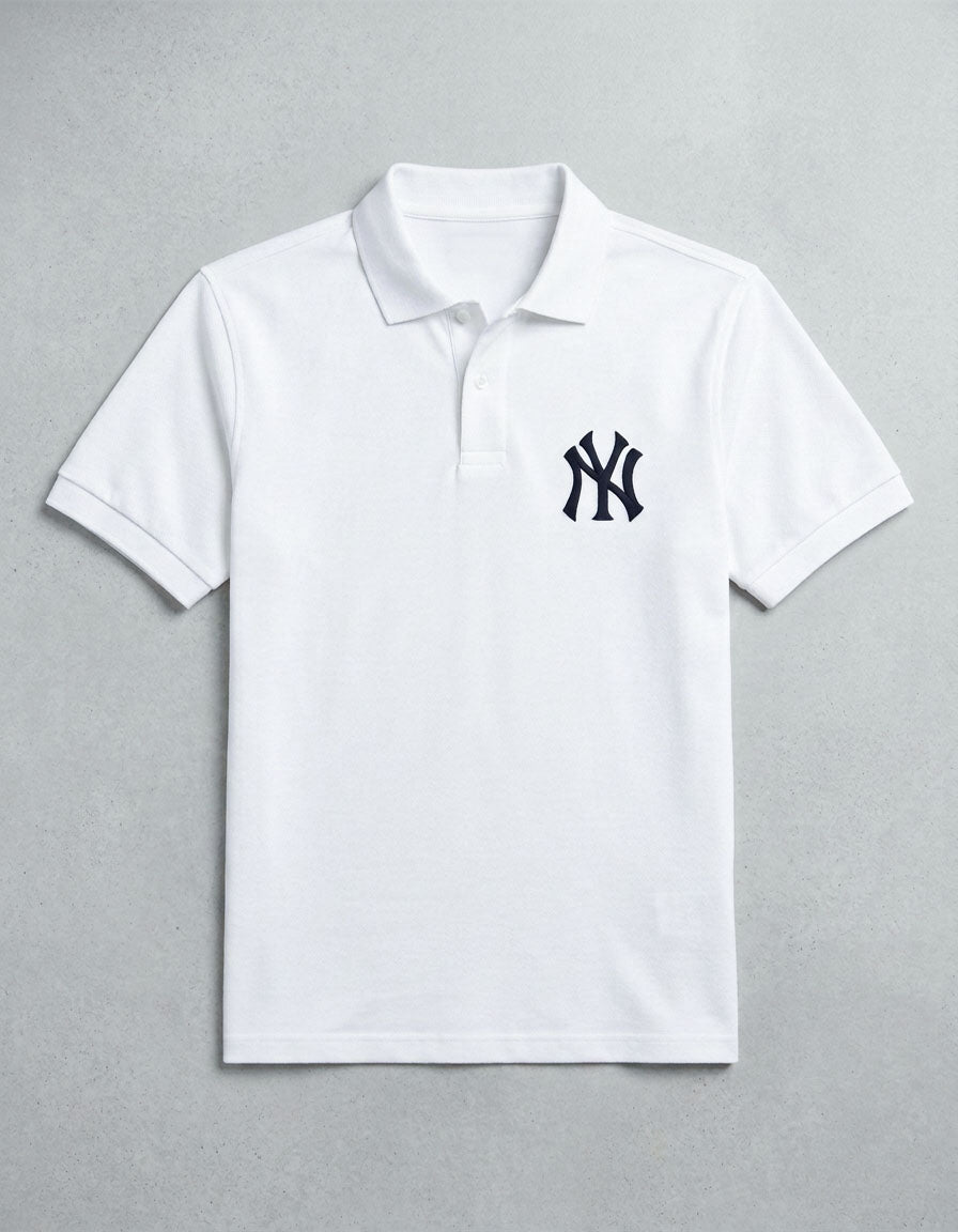 The crisp white base paired with the NY embroidered detail creates a clean and modern aesthetic that works perfectly for both casual and smart-casual styling. Designed with a structured polo collar and a comfortable regular fit, this piece offers a balanced combination of sophistication and everyday versatility.