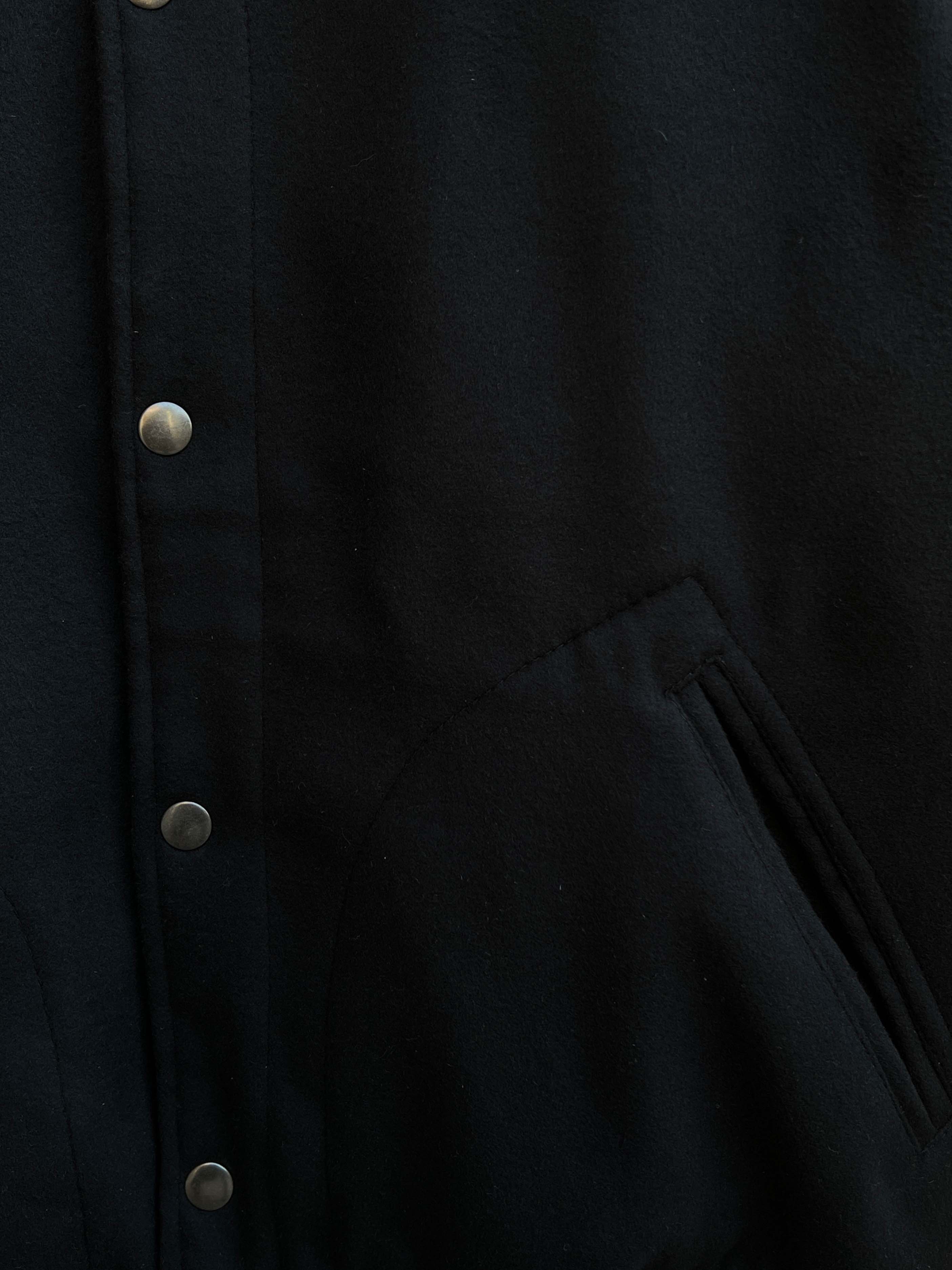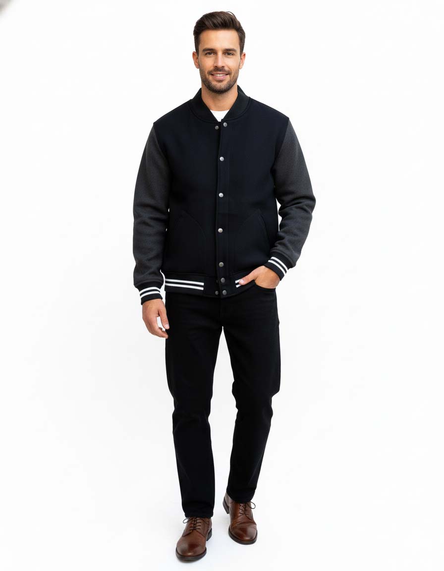 Pair this Black Wool Bomber Jacket with slim-fit denim, charcoal trousers, or a neutral knit layer for a modern, elevated winter look. A white tee or turtleneck underneath adds contrast and sharpens the silhouette — ideal for outings, meetings, or evening wear.